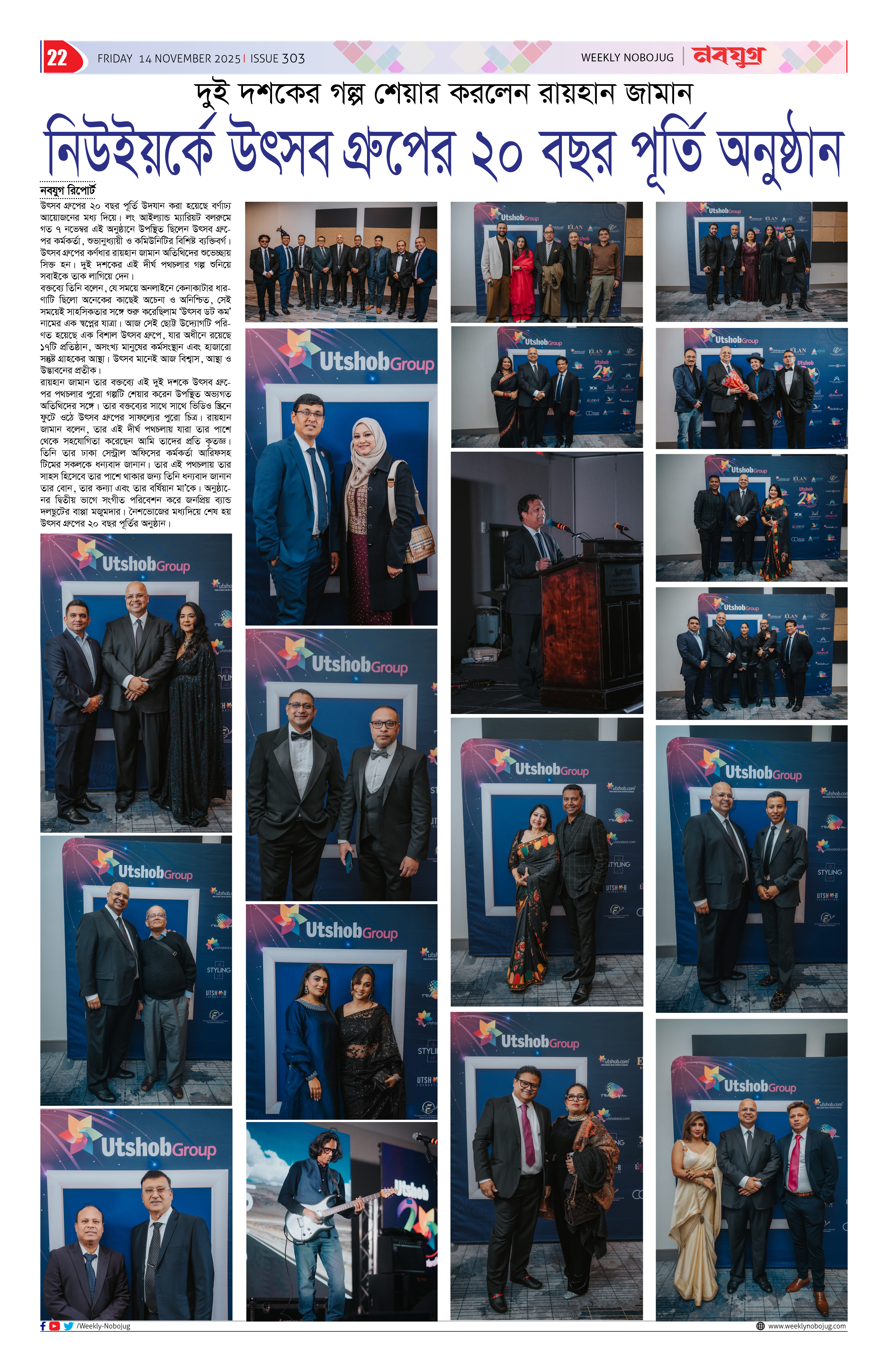উৎসব গ্রুপের ২০ বছর পূর্তি উদযান করা হয়েছে বর্ণাঢ্য আয়োজনের মধ্য দিয়ে। লং আইল্যান্ড ম্যারিয়ট বলরুমে গত ৭ নভেম্বর এই অনুষ্ঠানে উপস্থিত ছিলেন উৎসব গ্রুপের কর্মকর্তা, শুভানুধ্যায়ী ও কমিউনিটির বিশিষ্ট ব্যক্তিবর্গ। উৎসব গ্রুপের কর্ণধার রায়হান জামান অতিথিদের শুভেচ্ছায় সিক্ত হন। দুই দশকের এই দীর্ঘ পথচলার গল্প শুনিয়ে সবাইকে তাক লাগিয়ে দেন।